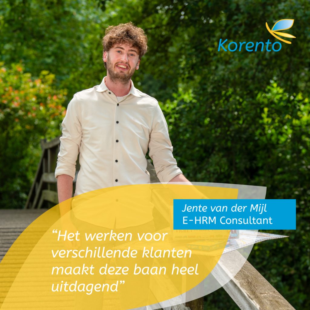 Mijn naam is Jente van der Mijl. Ik ben 28 en sinds 15 april 2024 ben ik een nieuwe uitdaging aangegaan als E-HRM consultant bij korento!