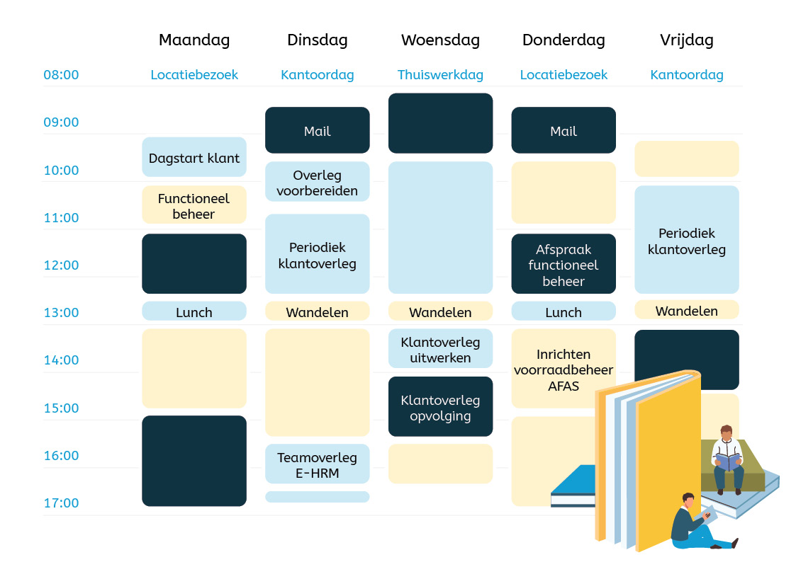 Je werk is afwisselend en uitdagend: je werkt aan meerdere projecten tegelijkertijd en geen dag is hetzelfde. Jouw week kan er bijvoorbeeld zo uitzien: